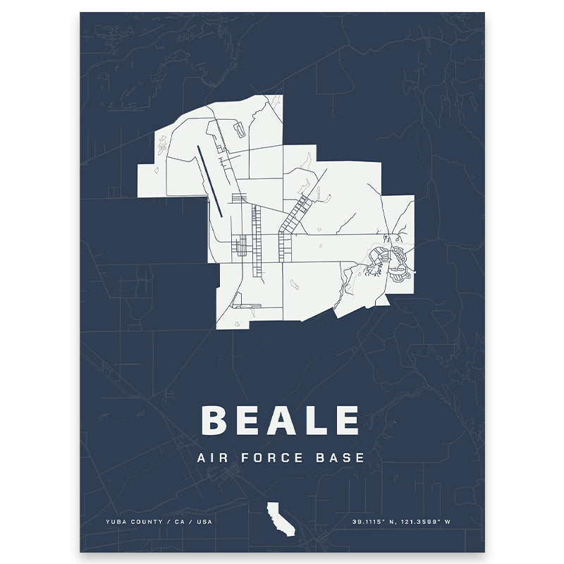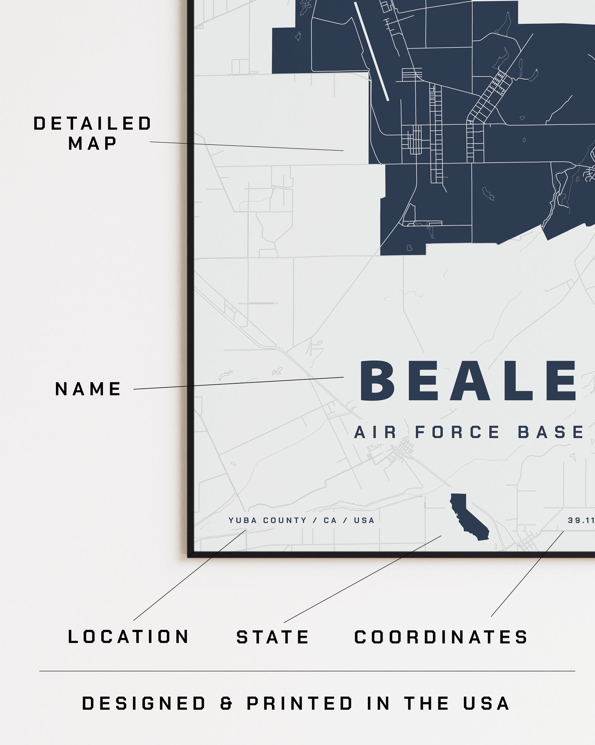 Created by a military wife to commemorate each military family's journey, this map of Beale AFB is a meaningful way to add art to your home. Collect every place you've been stationed for an effortless gallery wall that tells your story.