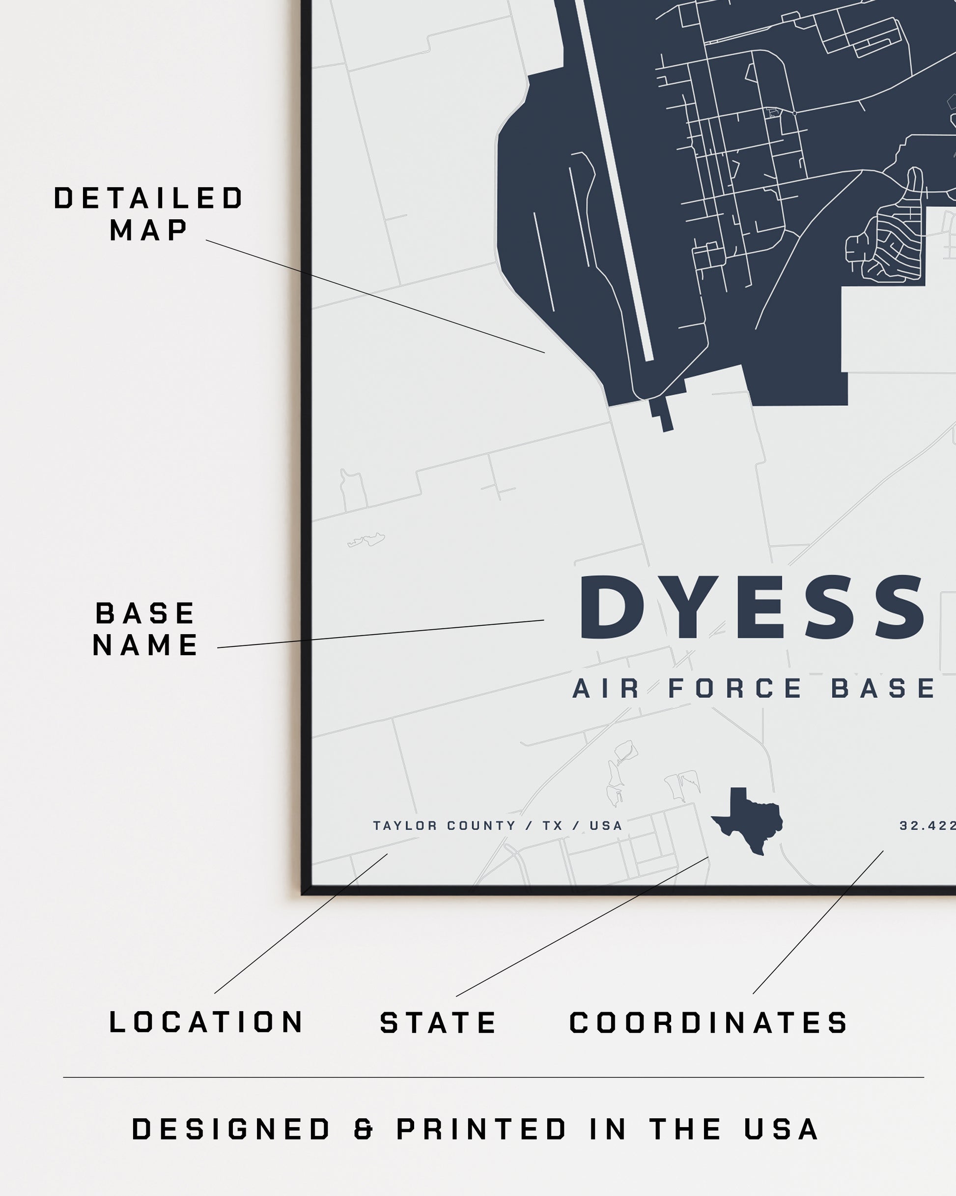 Created by a military wife to commemorate each military family's journey, this map of Dyess AFB is a meaningful way to add art to your home. Collect every place you've been stationed for an effortless gallery wall that tells your story.